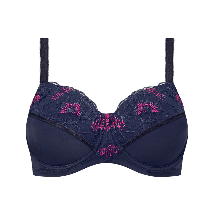 The Amoena Delia Underwired Lace Mastectomy Bra in Navy & Pink offers both style and support for women after breast surgery. Designed with a delicate floral embroidery on an elastic mesh base, this underwired bra creates a flattering neckline while providing gentle shaping.