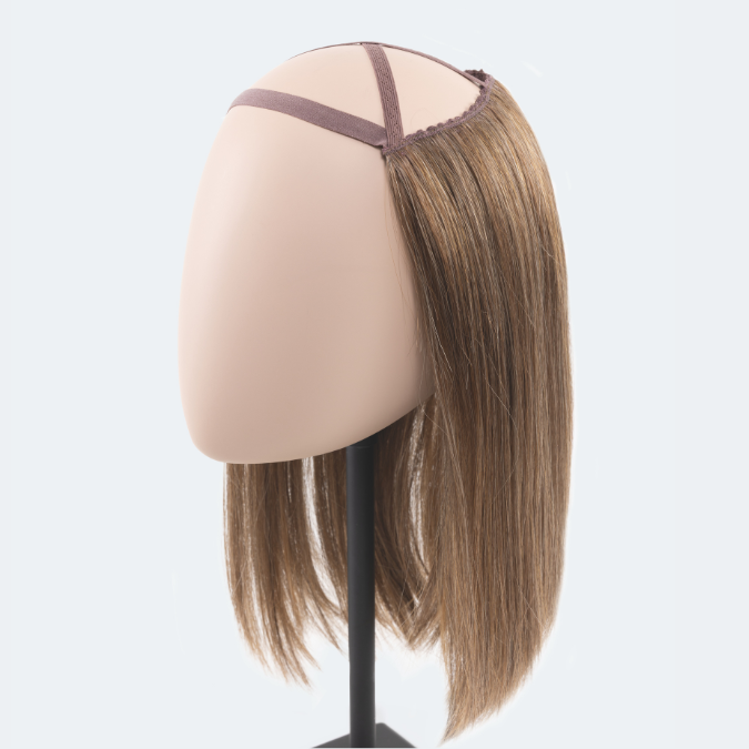 This Cayenne Hair Halo is slightly different from others as it is thicker with more hair attached. This style has a honeycomb cap that covers the lower part of your head, from the nape of your neck up to the crown. The hair falls perfectly by your temples, just in front of your ears, great for covering where your natural locks would be.