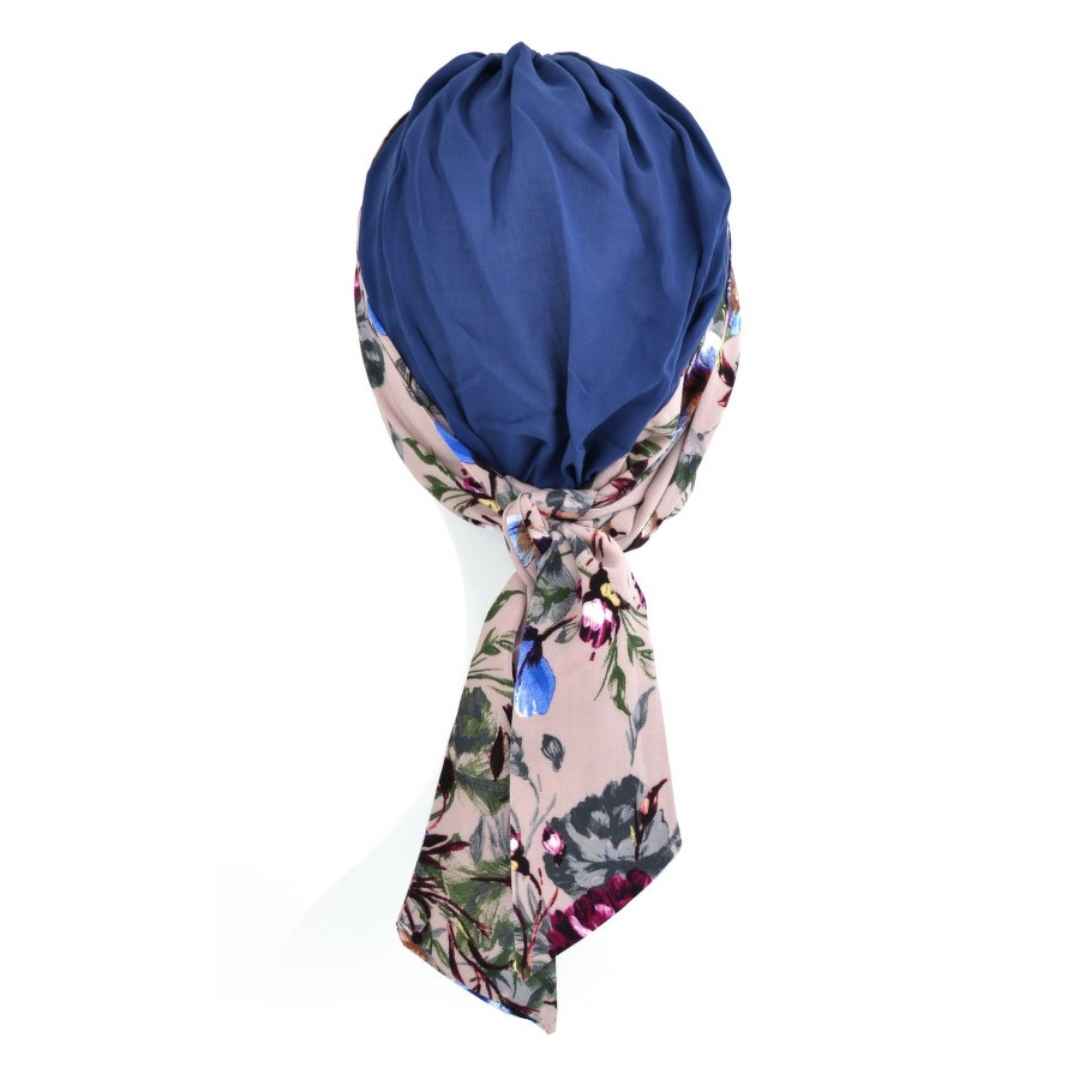 The beautiful blue patterned Aster turban is a lightweight and versatile headwear option designed for women experiencing hair loss due to chemotherapy, alopecia, or other medical conditions. Featuring a soft blue floral pattern, it brings a fresh, calming feel to your look while remaining easy to style with everyday outfits.