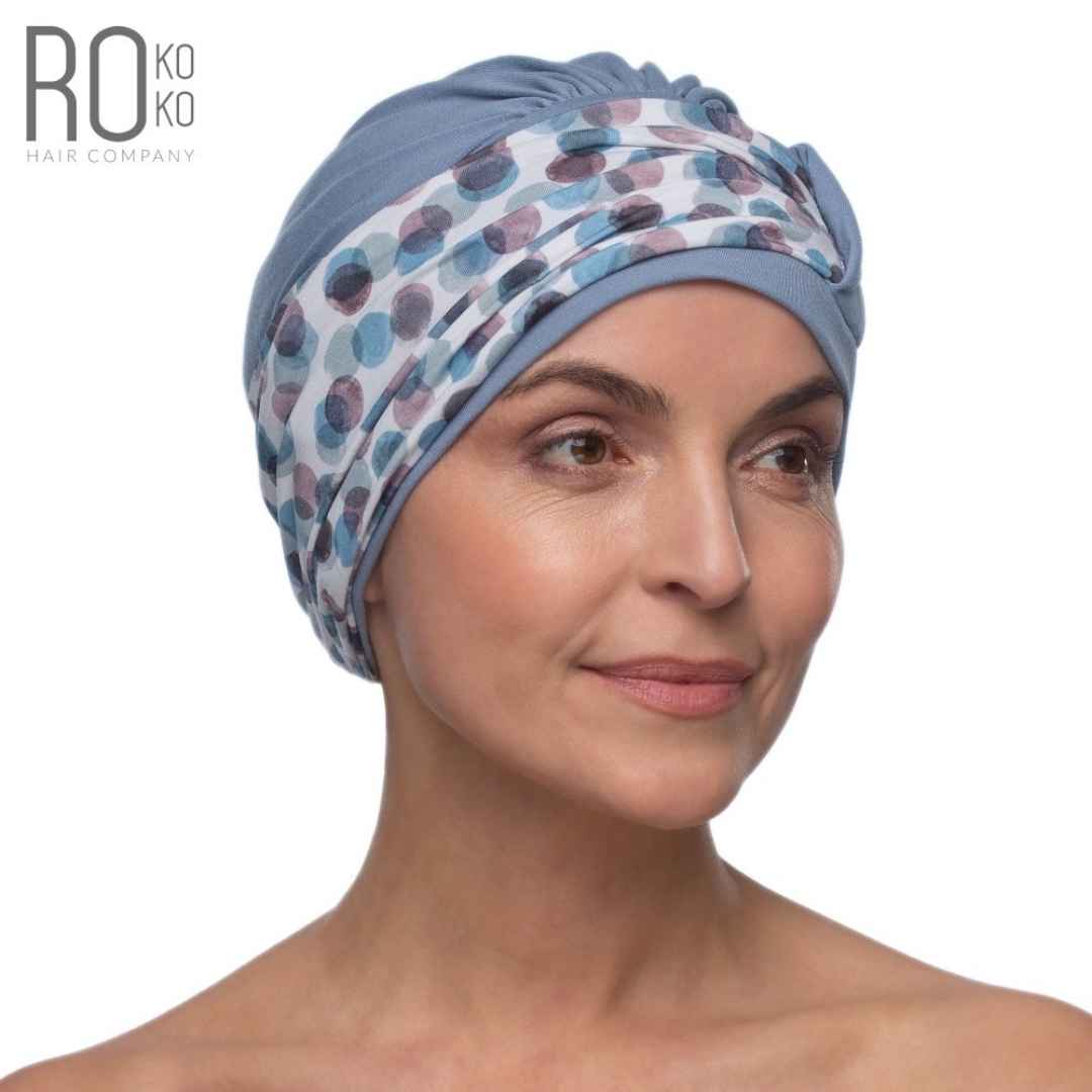 This blue Bombay turban from Rokoko offers a modern and asymmetric headwear style that’s both comfortable and expressive. Designed with women experiencing hair loss due to chemotherapy, alopecia, or other conditions in mind, this turban combines a soft, flexible base with a bold patterned sash for a standout look.